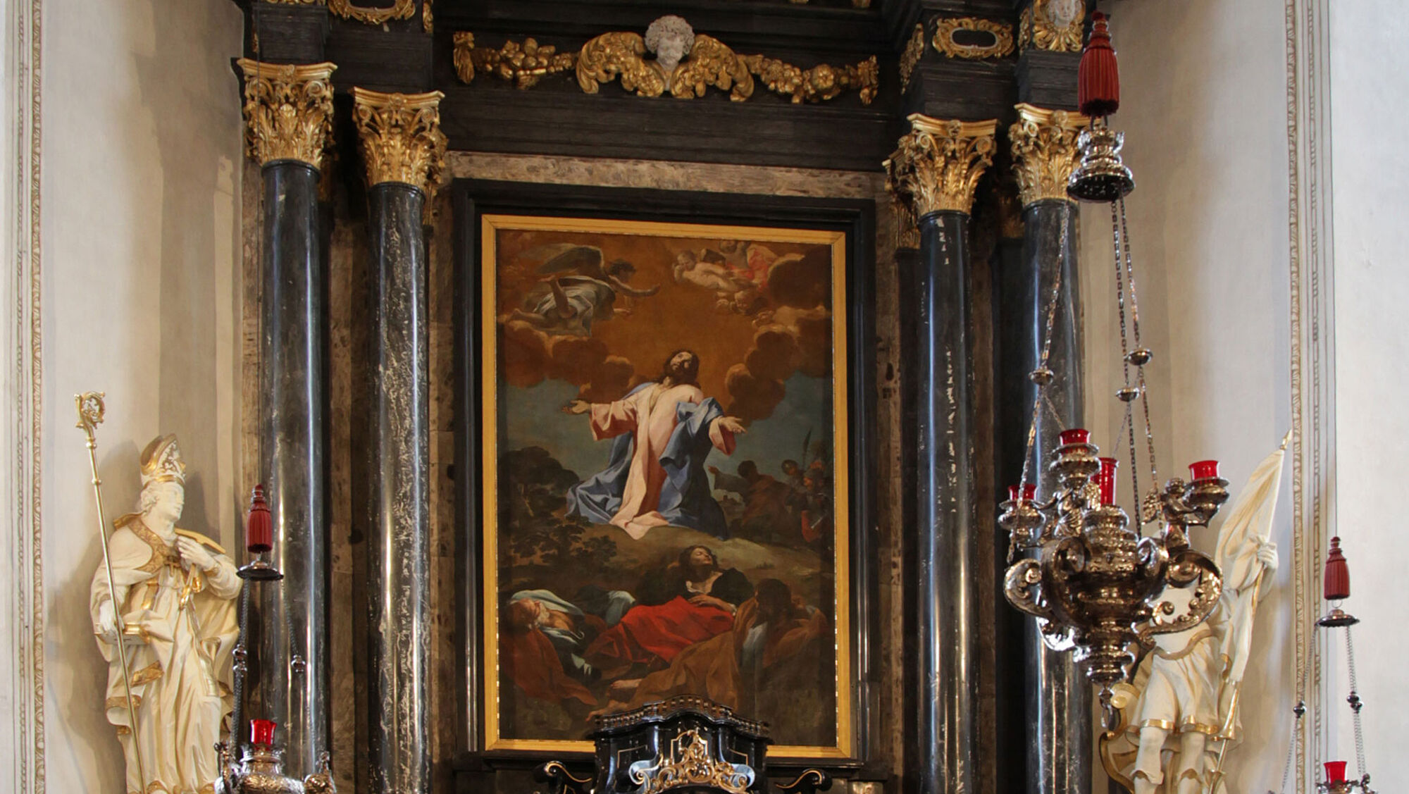 Der Hochaltar wurde nach einem römischen Entwurf in schwarz-grauem Marmor gebaut, der aus einem Steinbruch am Stanserhorn stammt. Die weissen Teile sind aus Alabaster, der ebenfalls in der Innerschweiz gebrochen wurde. Nach seiner Aufrichtung 1639 machte der Altar auf die Gläubigen mächtigen Eindruck, denn bis jetzt wurde diesseits der Alpen noch nie ein Altar in römischem, klassischem Barock errichtet. Das Altarbild mit der Ölbergszene malte der römische Maler Giovanni Lanfranco.