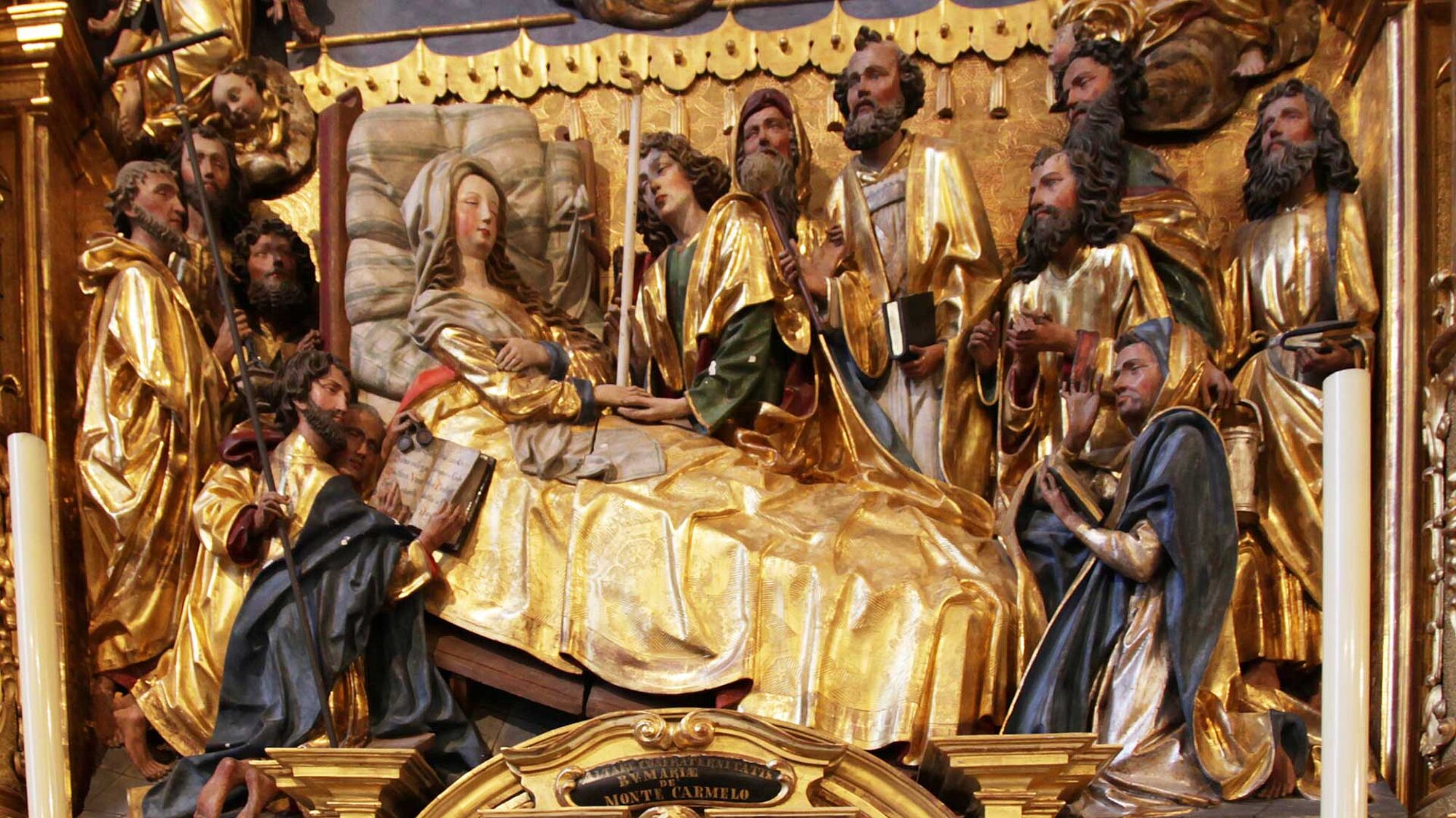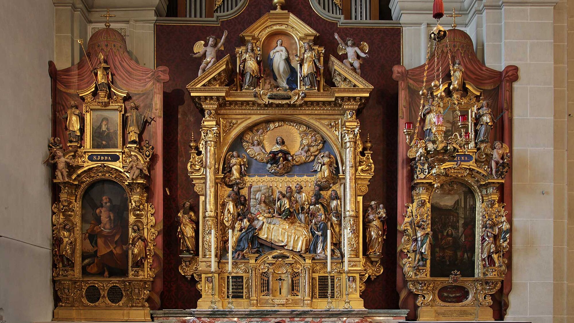 Der Maria-End-Altar enthält eine rechteckige Schnitztafel, die aus der 1633 abgebrannten Kirche gerettet wurde. Die Darstellung des Todes Marias geht auf einen Stich von Martin Schongauer zurück. Auch hier wurde die gotische Tafel geschickt in den um 1640 errichteten Altar einbezogen. Die expressiv gestalteten Apostel sind eindrücklich um das Bett der sterbenden Maria gruppiert. Dieser Altar gilt als der Schönste der Hofkirche. Darüber sind Orgelpfeifen der Walpenorgel (Chororgel) sichtbar. Sie wurde 1842-44 erbaut.