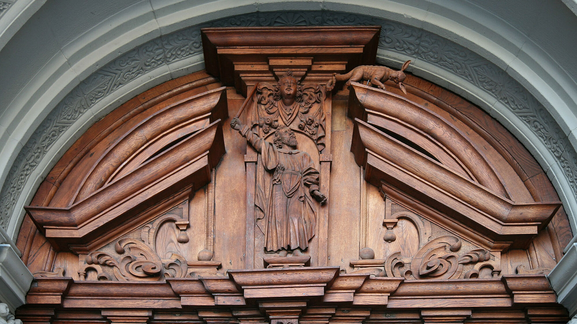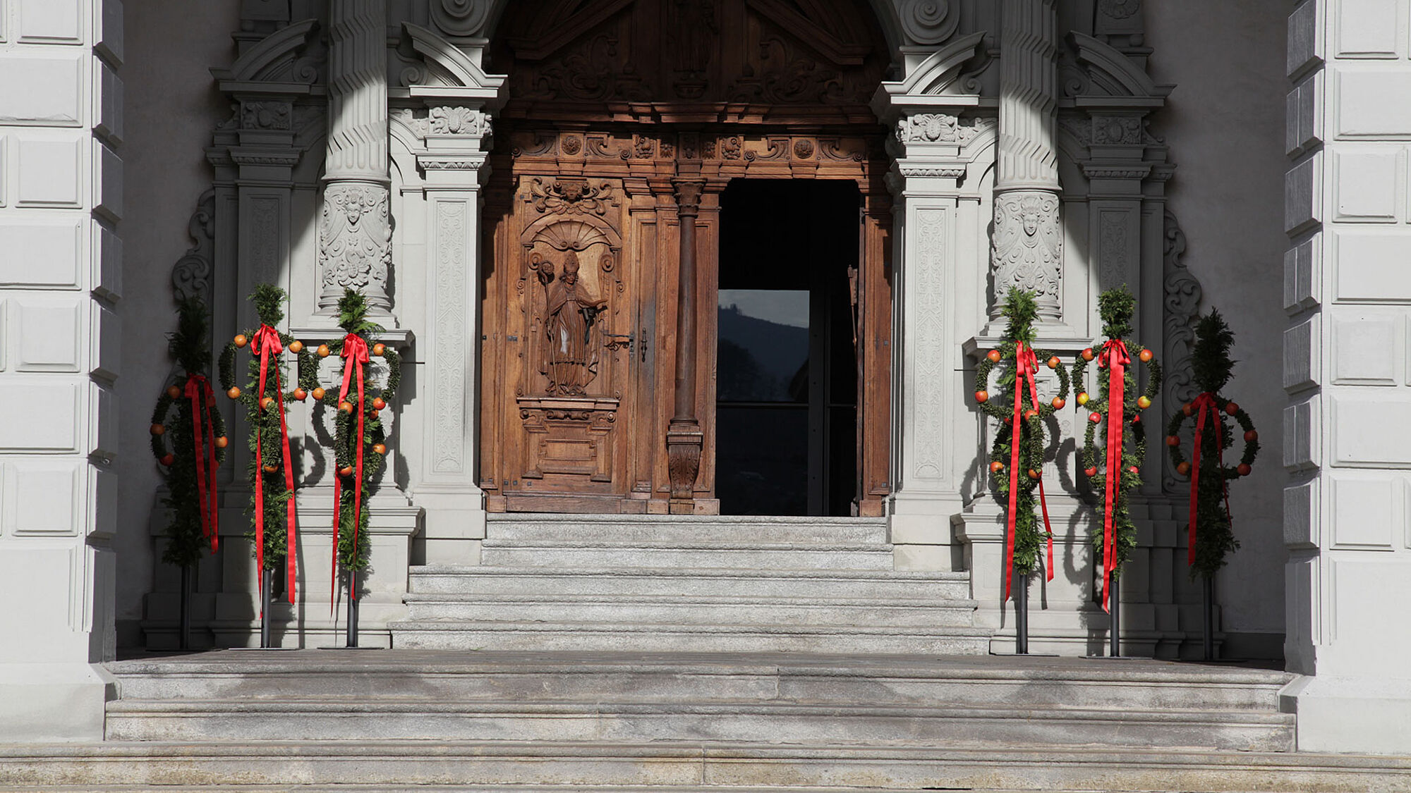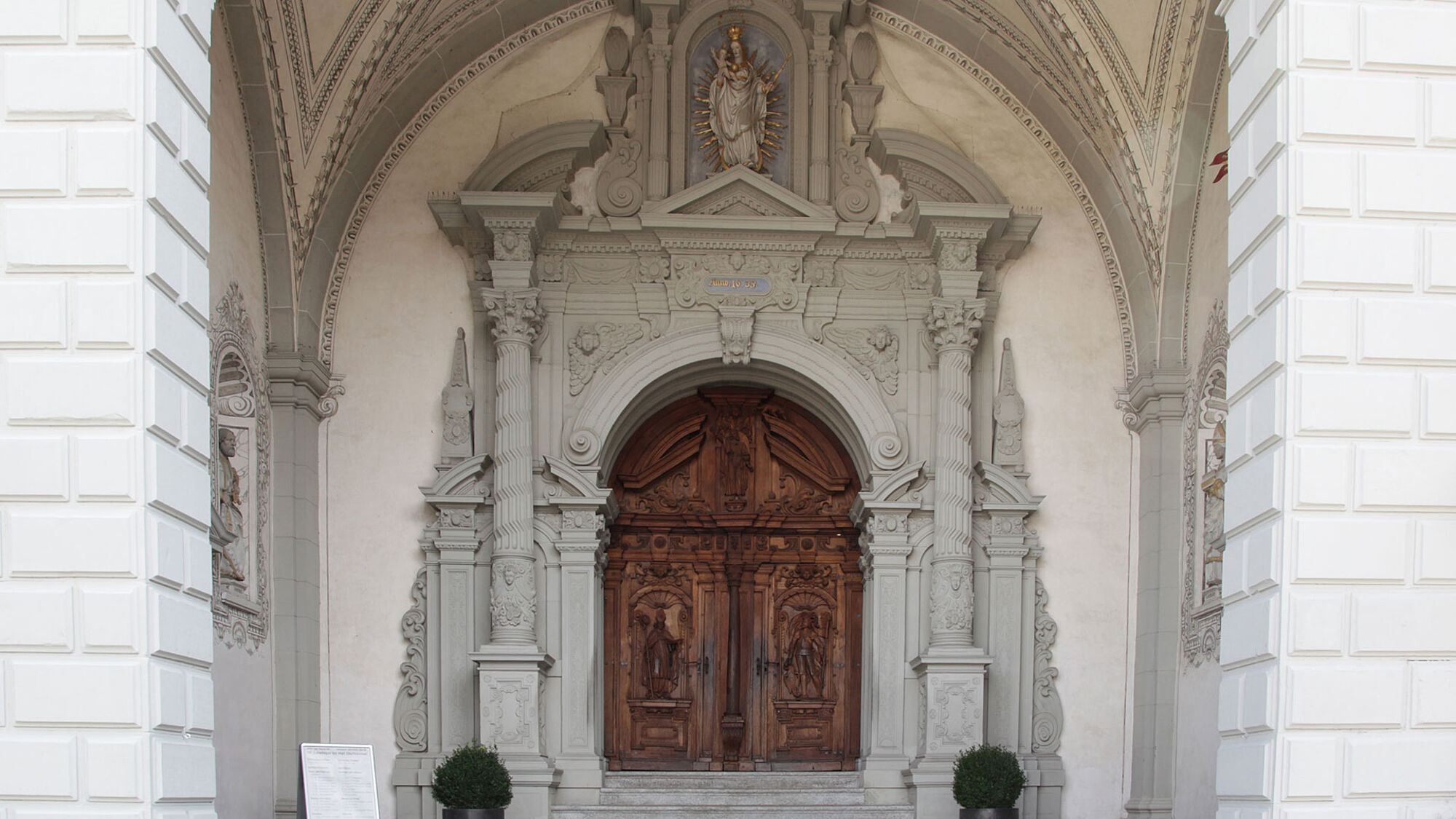In der Vorhalle stehen fünf Heiligenstatuen, die an der Fassade der alten Kirche angebracht waren. Sie konnten beim Brand gerettet werden. Die sechste Figur (Hl. Clemens) wurde beim Neubau der Kirche hinzugefügt. Der schöne Sandstein der Türeinfassung stammt aus dem Steinbruch des heutigen Löwendenkmals. Über dem Portal befindet sich eine bemerkenswerte Muttergottesstatue mit Kind im Strahlenkranz. In den Flachnischen der reich geschnitzten Holztüre sind links der Hl. Leodegar und rechts der Hl. Mauritius zu sehen und über dem Gebälk der Hl. Beat mit Drache.