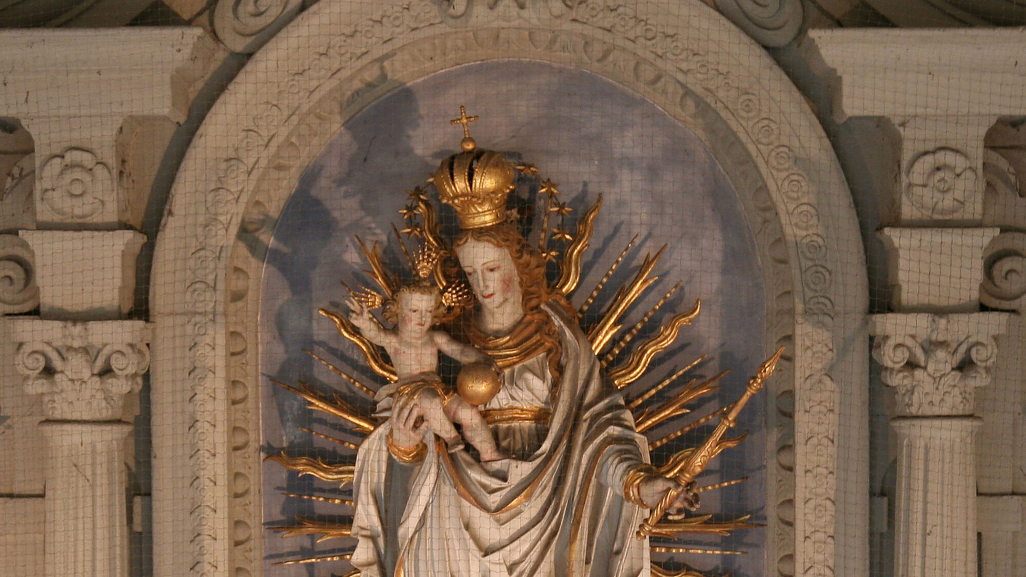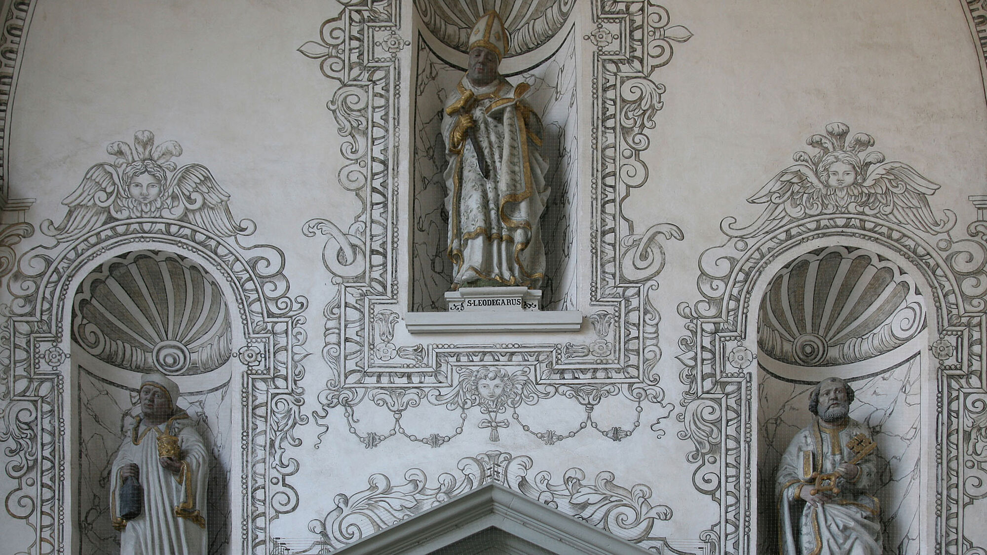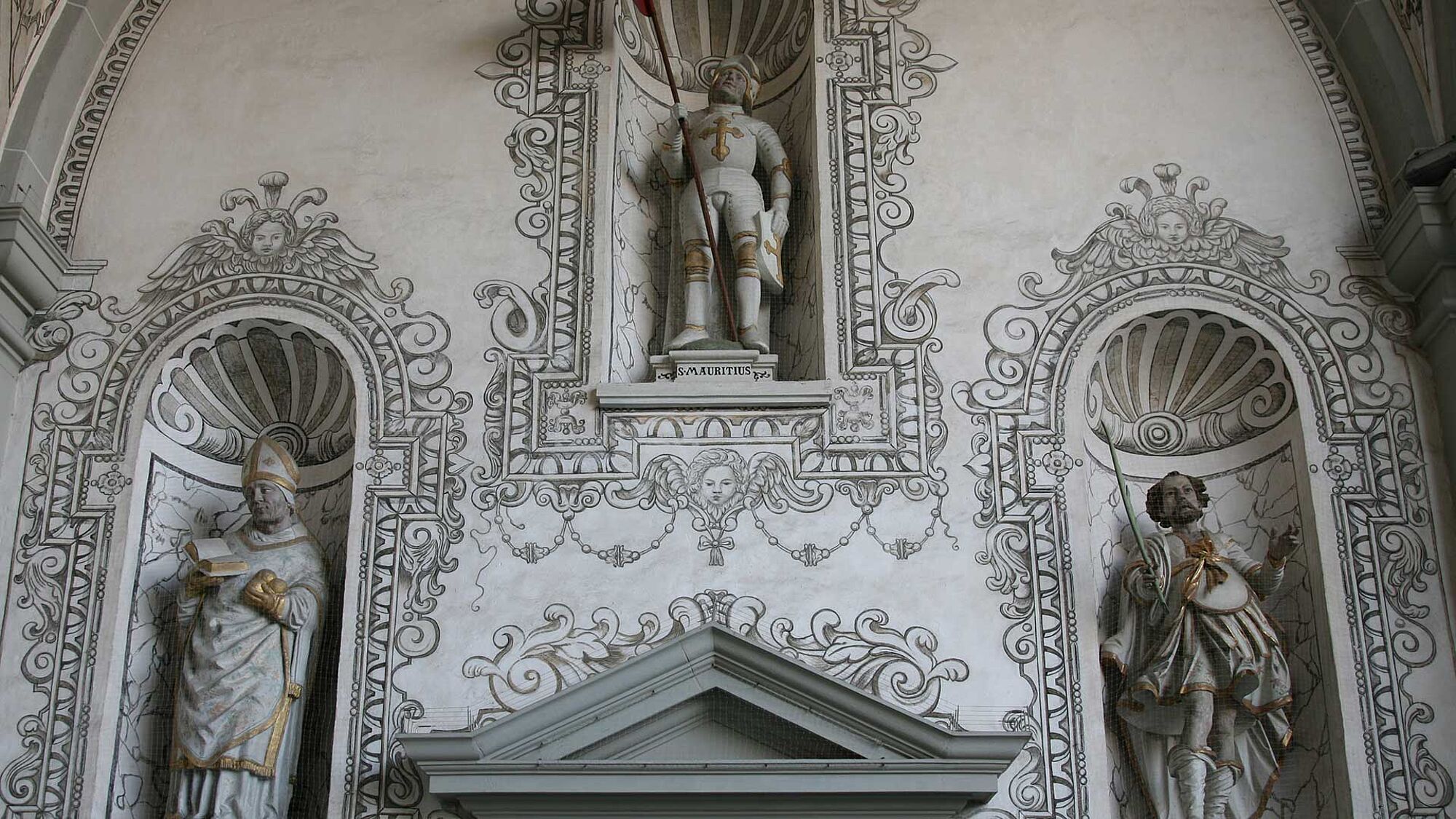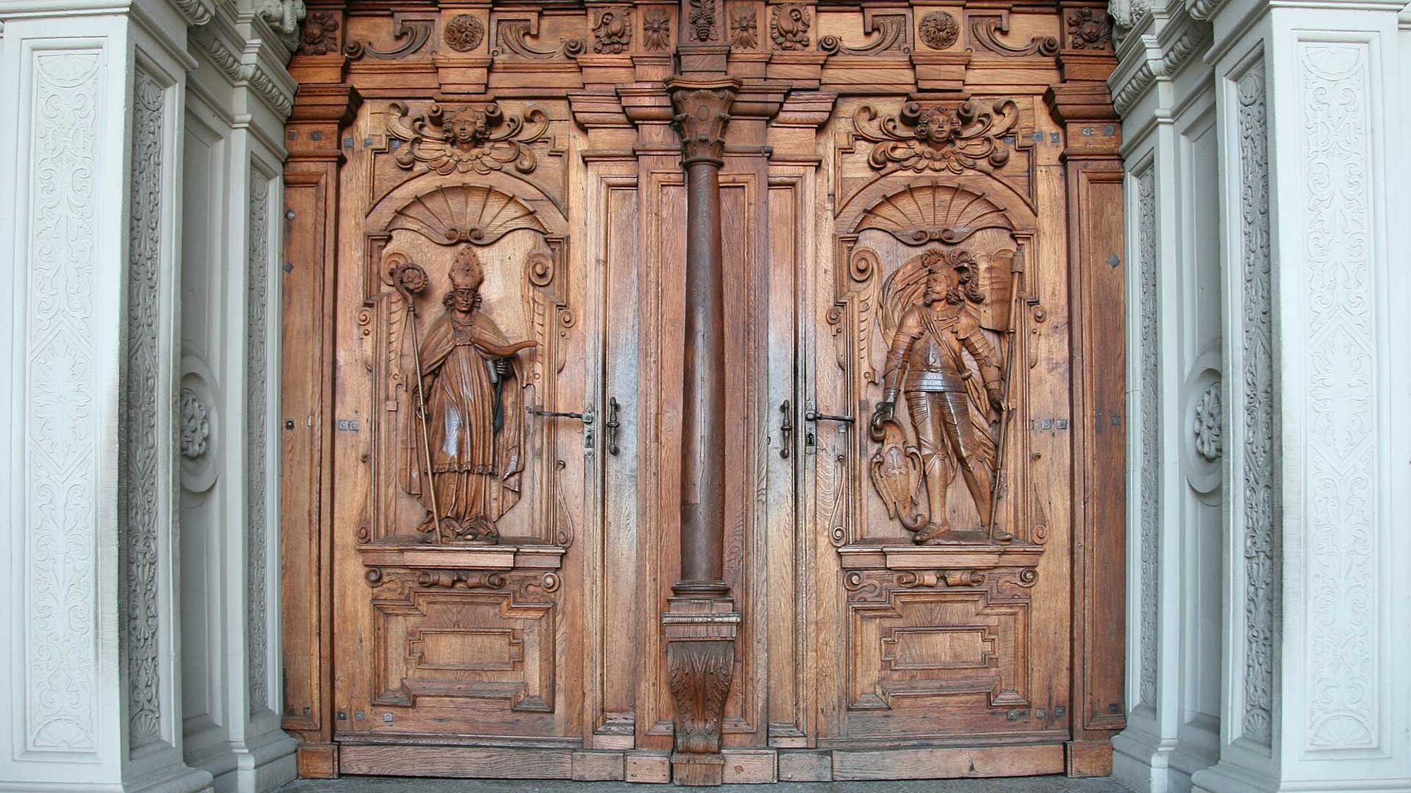 In der Vorhalle stehen fünf Heiligenstatuen, die an der Fassade der alten Kirche angebracht waren. Sie konnten beim Brand gerettet werden. Die sechste Figur (Hl. Clemens) wurde beim Neubau der Kirche hinzugefügt. Der schöne Sandstein der Türeinfassung stammt aus dem Steinbruch des heutigen Löwendenkmals. Über dem Portal befindet sich eine bemerkenswerte Muttergottesstatue mit Kind im Strahlenkranz. In den Flachnischen der reich geschnitzten Holztüre sind links der Hl. Leodegar und rechts der Hl. Mauritius zu sehen und über dem Gebälk der Hl. Beat mit Drache.